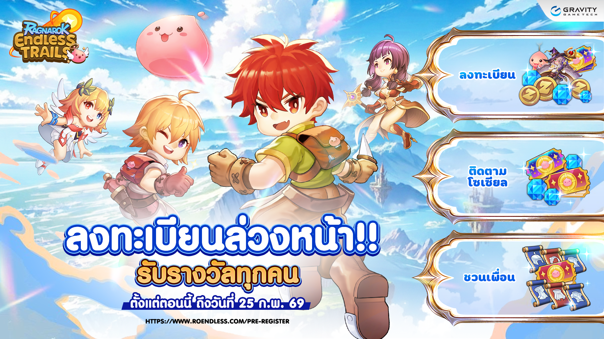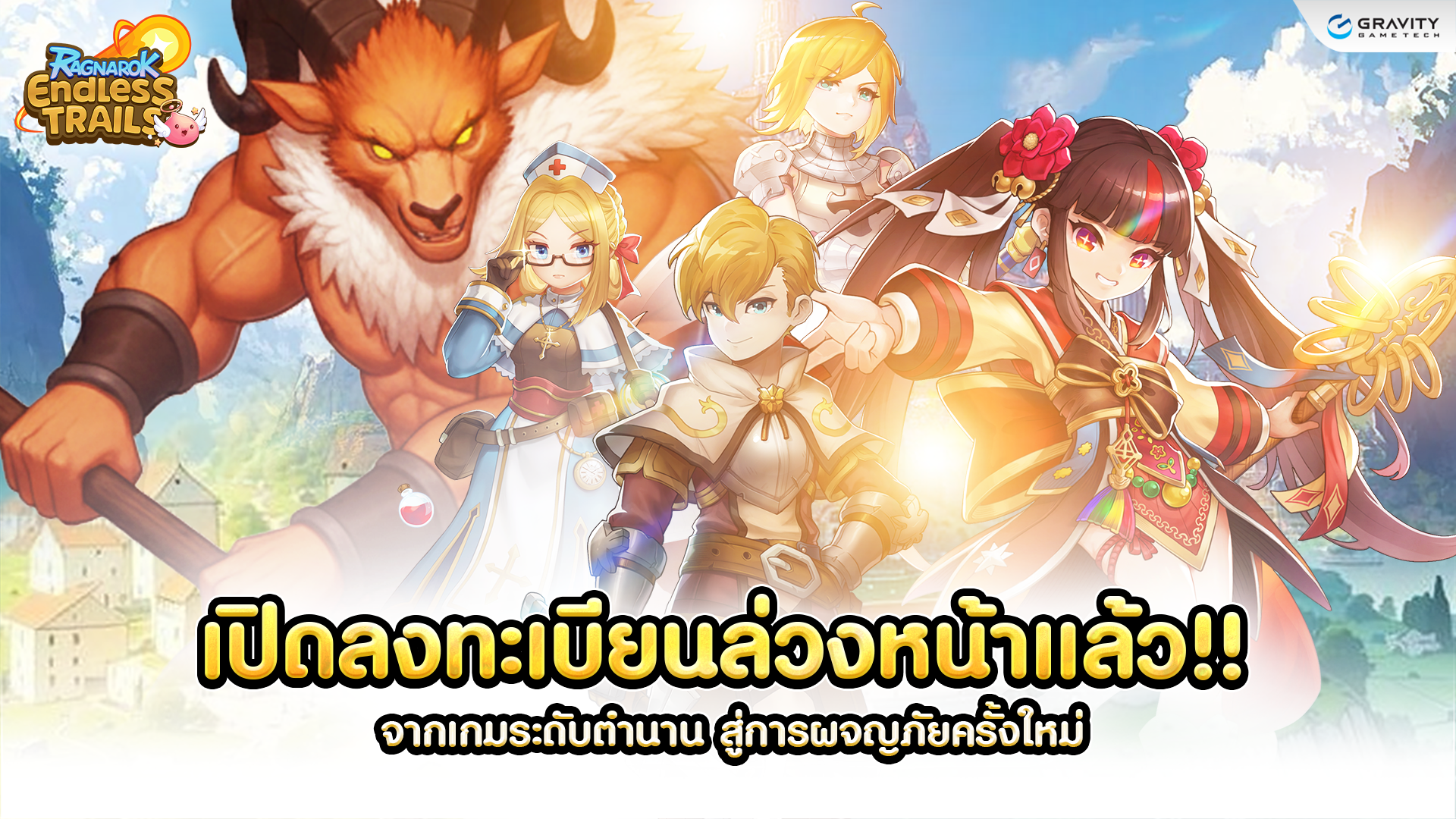 ร่วมสร้างประสบการณ์การเล่นที่ไม่เหมือนใคร และแตกต่างจากเดิม จากแฟรนไชส์แร็คนาร็อค สำหรับเกม “Ragnarok Endless Trails” จะเปิดให้บริการในทั่วภูมิภาคเอเชียตะวันออกเฉียงใต้ ได้แก่ ประเทศไทย, อินโดนีเซีย, ฟิลิปปินส์, มาเลเซีย และสิงคโปร์ ในเร็ว ๆ นี้ (ประมาณช่วง Q1 ของปี 2569) และสามารถร่วมกิจกรรมลงทะเบียนล่วงหน้าได้ที่นี่ >>> https://www.roendless.com/pre-register ตั้งแต่ตอนนี้ ถึงวันที่ 25 กุมภาพันธ์ 2569 เพื่อรับรางวัลสุดพิเศษในช่วงเกมเปิดให้บริการอย่างเป็นทางการ