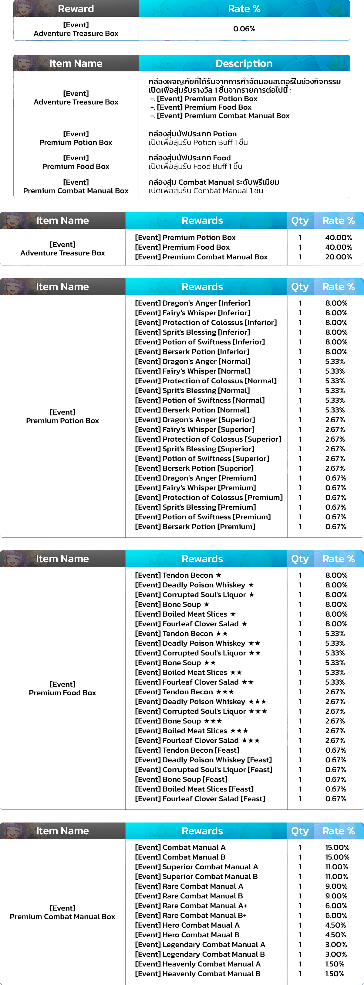 -. ผู้เล่นมีโอกาสได้รับ Adventure Treasure Box เมื่อกำจัดมอนสเตอร์ในแผนที่ทั่วไป