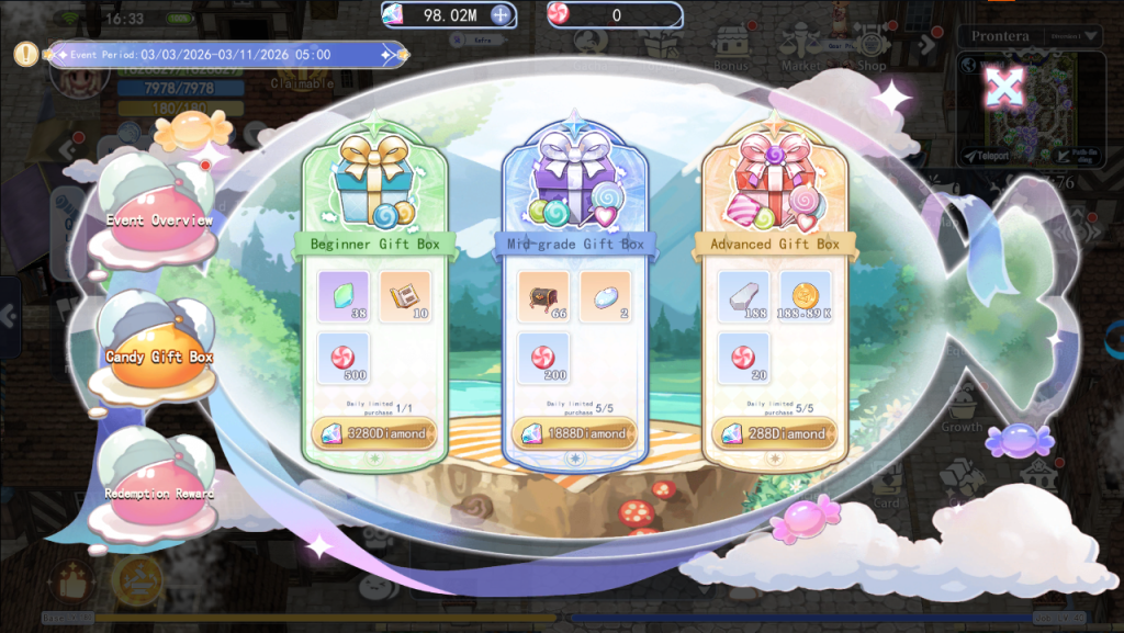 Jika Candy tidak mencukupi, Adventurer dapat membeli Candy tambahan melalui Candy Gift Box! Selain mendapatkan Candy dari paket, Adventurer juga akan memperoleh Candy tambahan dari penggunaan Diamond saat pembelian. Dapatkan Candy 2 kali lipat dan tingkatkan peluang untuk menukarkan hadiah spesial!