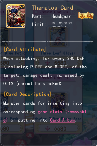 Setiap 240 DEF (termasuk P.DEF dan M.DEF) saat menyerang, DMG akan meningkat 0,1% (tidak dapat distack)