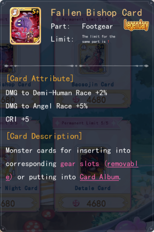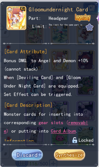 Saat mengenakan Gloom Under Night Card dan Deviling Card, akan meningkatkan damage terhadap Demi-Human.