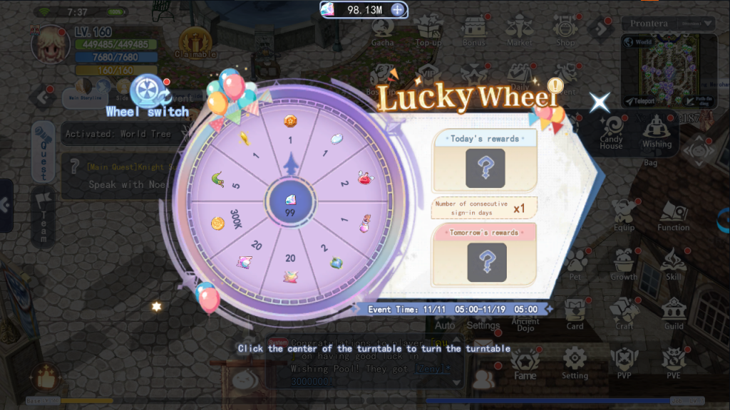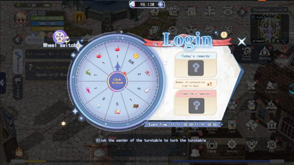 1.Setiap kali login, pemain akan mendapatkan 1 kesempatan memutar Lucky Wheel dan langsung menerima hadiah setelah diputar