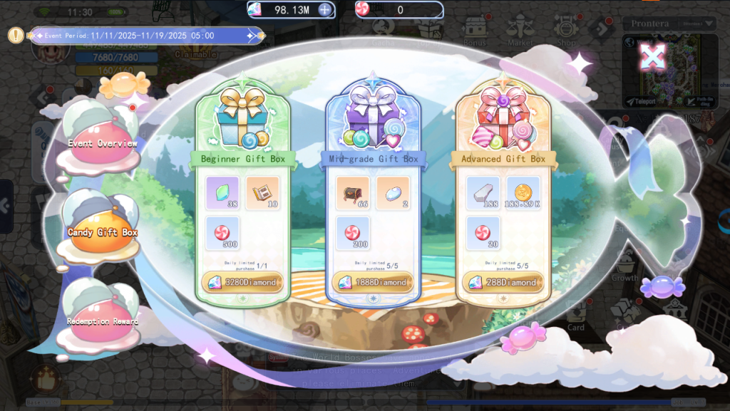 Dapatkan Candy gratis setiap hari melalui event Candy House! Cukup ikut serta dalam event ini dan kumpulkan Candy, lalu tukarkan dengan S+ Card atau Blessed Ore yang digunakan untuk melakukan upgrade item dalam game!